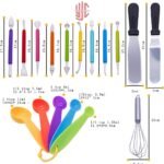 Complete 66 pieces cake decorating supplies kits: 1 cake turntable, 1 cake leveler/cutter, 1 chocolate tray, 48 icing sugar tips, 3 icing smoothers, 1 spatula with straight and offset spacing, 100 disposal bags, 6 silicone and 100 paper cupcakes, 7 Russian tips, 1 egg beat. 1 decorating pen, 1 silicone cream spatula, 5 measuring spoons, cream flower nail & lifter & scissors.