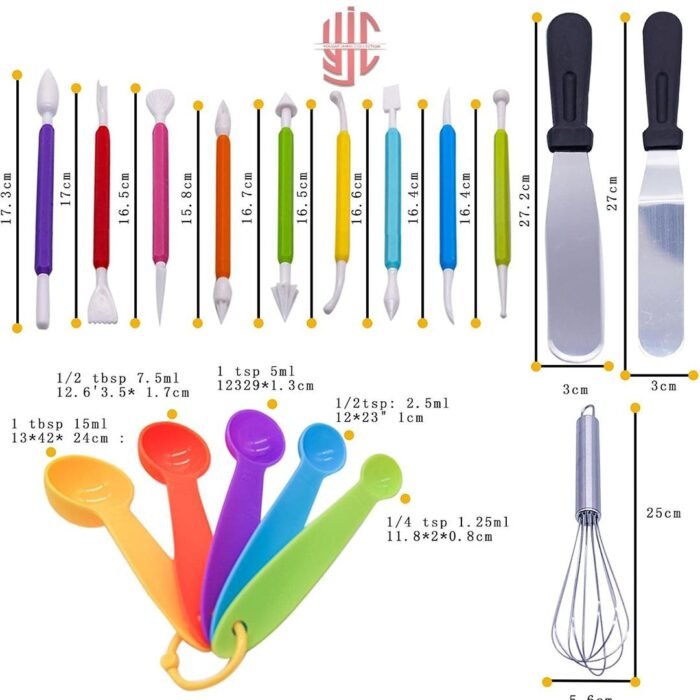 Complete 66 pieces cake decorating supplies kits: 1 cake turntable, 1 cake leveler/cutter, 1 chocolate tray, 48 icing sugar tips, 3 icing smoothers, 1 spatula with straight and offset spacing, 100 disposal bags, 6 silicone and 100 paper cupcakes, 7 Russian tips, 1 egg beat. 1 decorating pen, 1 silicone cream spatula, 5 measuring spoons, cream flower nail & lifter & scissors.